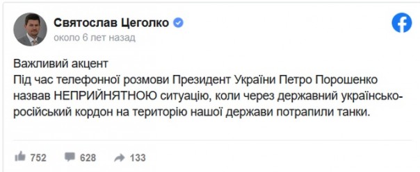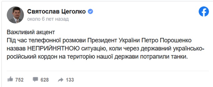 Ни в тот же вечер, ни в последующие дни у Порошенко не опровергали эту информацию. В тот день Цеголко опубликовал на своей странице пост, в котором лишь написал о протесте Порошенко против «вторжения в Украину российских танков».