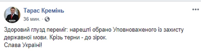 «Здравый смысл победил: наконец избран Уполномоченного по защите государственного языка. Сквозь тернии — к звездам. Слава Украине!» — прокомментировал свое назначение Креминь в соцсети.
