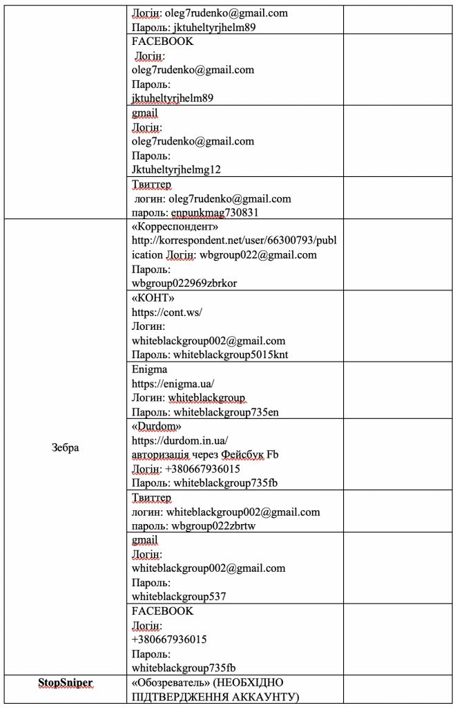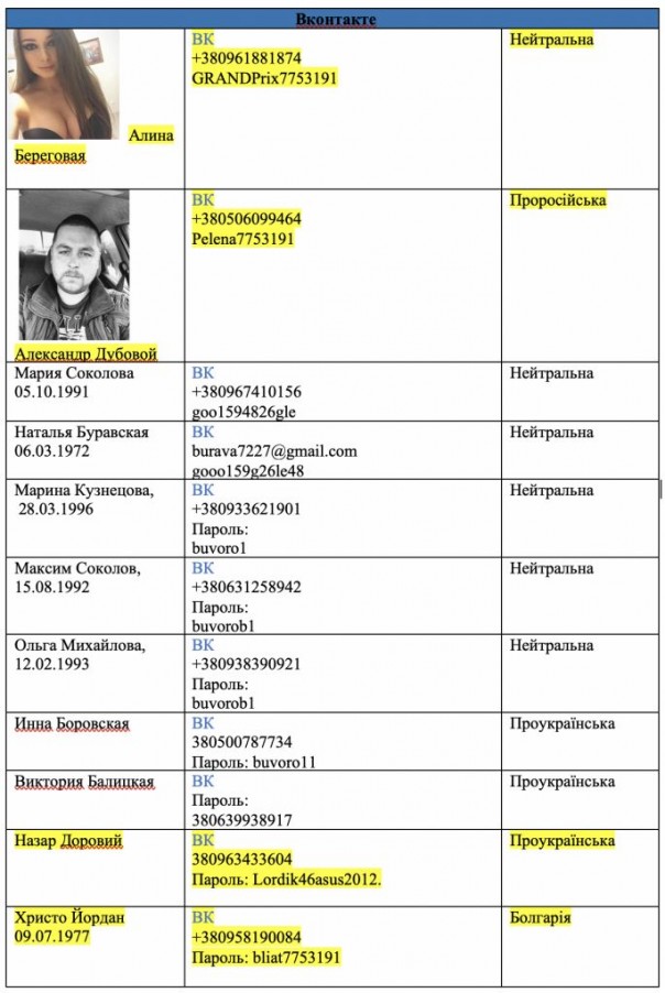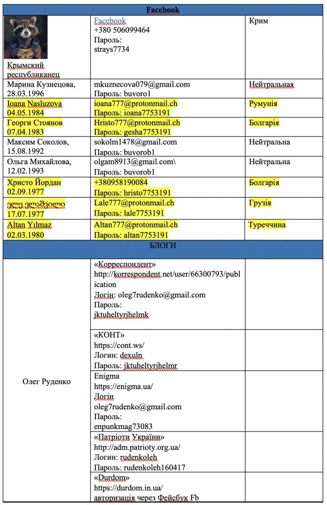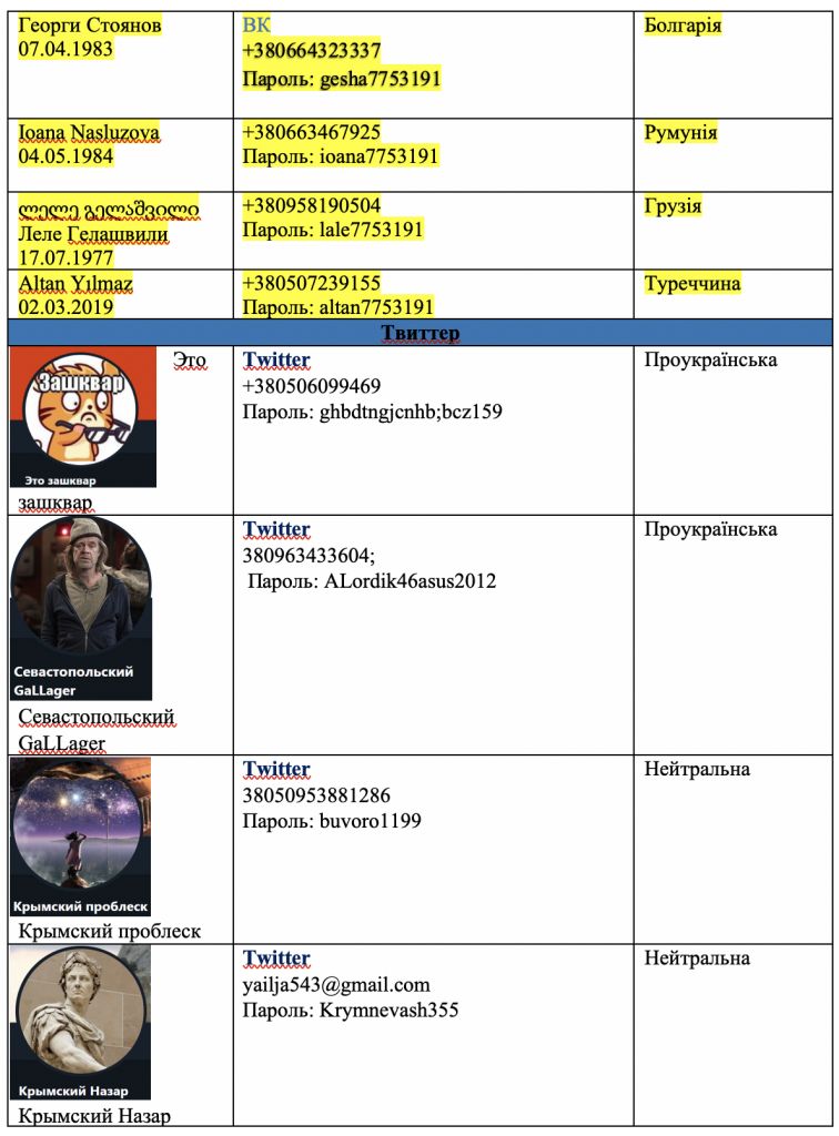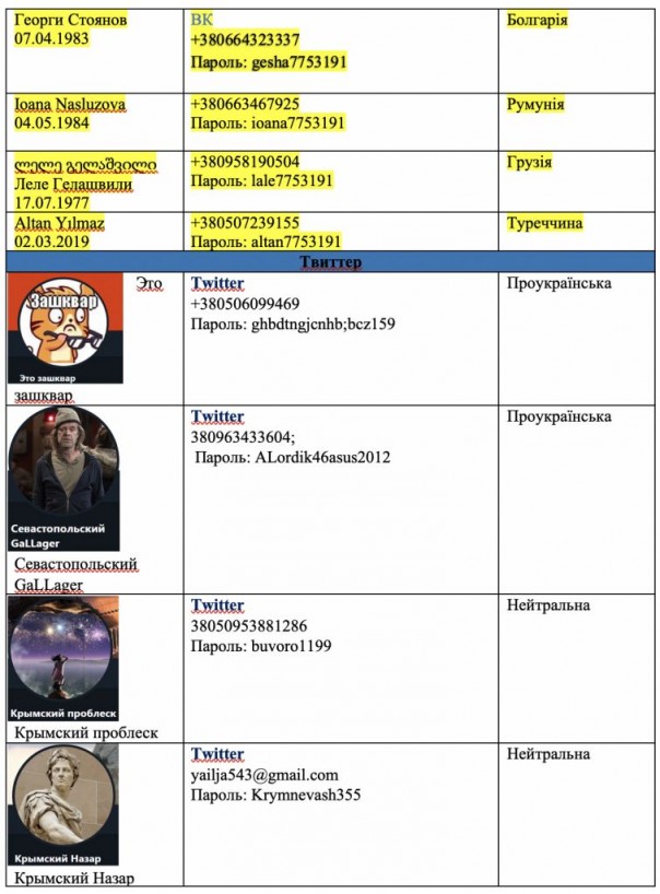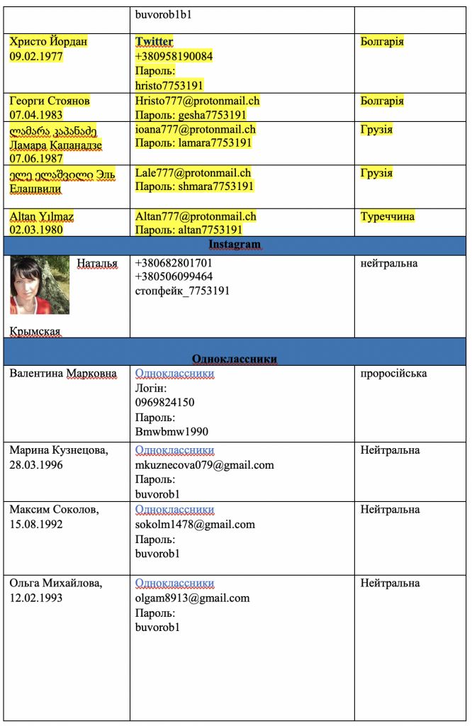 Но это что касается псевдо-личностей, персонажей вымышленных для красоты, картинки и прочих функции. Но в этом многочисленном войске украинских бесов есть целые отряды банальных троллей. Их задача — спамить комментами, лайкать и дизлайкать, «бить в набат», в общем наводить информационный шорох по приказу кураторов 83-го центра ИПсО ССО ВСУ. Эта полурота троллей рвется в бой, готовясь информационно воевать с Россией от имени «униженных и оскорбленных крымчан», болгар, грузин и прочей публики. В таблице указаны и пароли аккаунтов в соцсетях. Что характерно, в таблице троллей крайняя правая графа обозначена как «Позиция». У некоторых (единицы) она обозначена, как «пророссийская». Это наводит на мысль о том что аккаунты взломаны, и от имени обывателя мир информации засоряют все те же старлеи и «пидпилкывныки 83-го Центра ИПсО ССО ВСУ и провокаторы на аутсорсинге.
