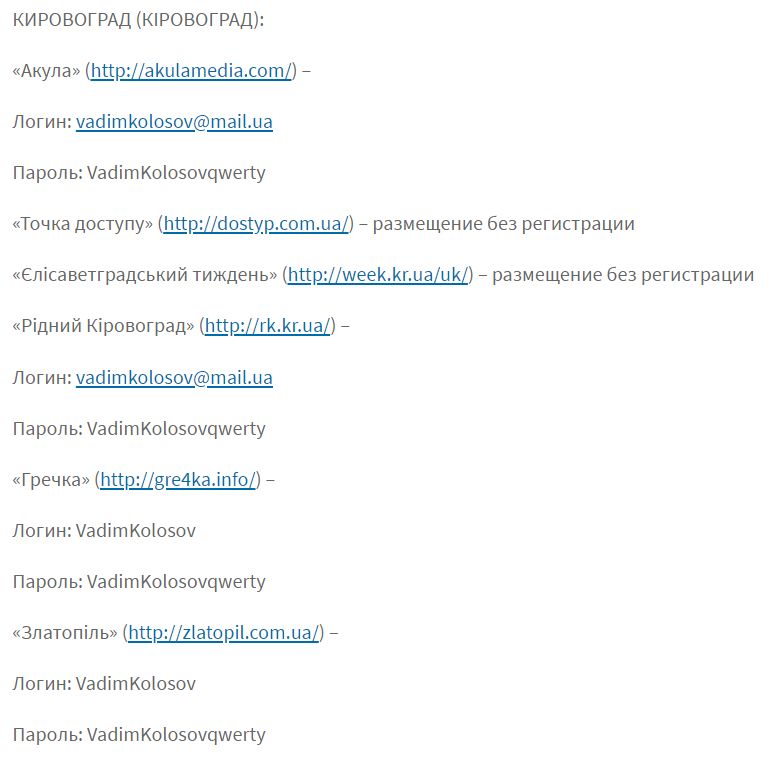 Можливість розміщення інформації від імені псевдоособи на наступних регіональних інтернет-ресурсах: