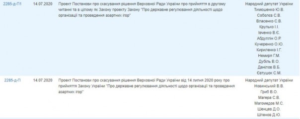 Как сообщается на сайте Верховной Рады Украины, 14 июля были зарегистрированы проект постановления №2286-д-П, инициированный группой нардепов во главе с Вадимом Новинским, и проект постановления №2286-д-П1 - группа депутатов фракции «Батькивщина» и внефракционных во главе с Юлией Тимошенко.