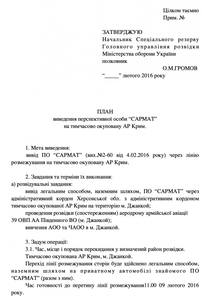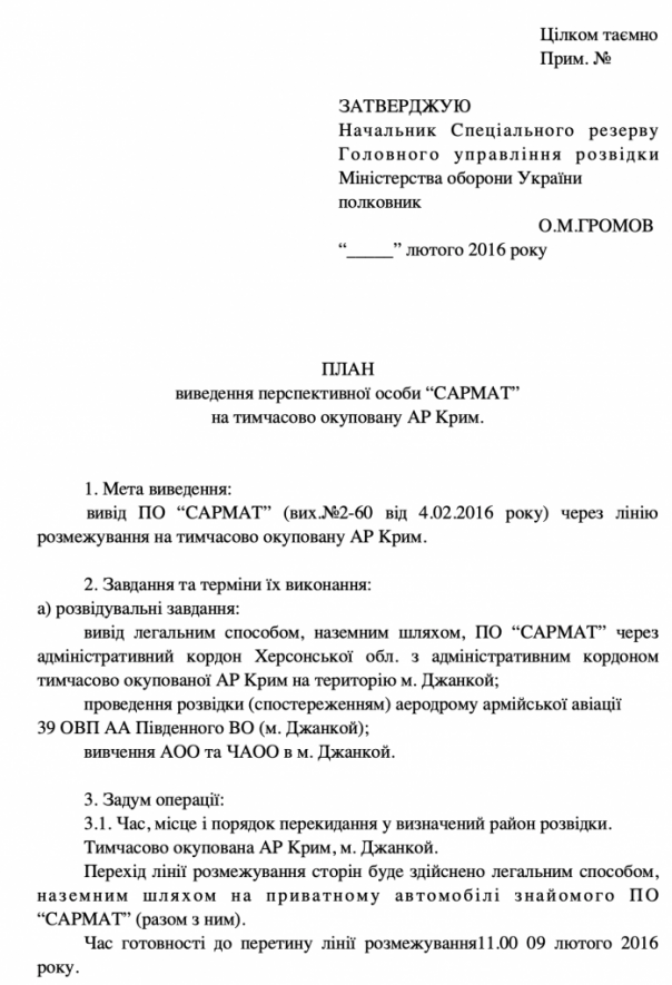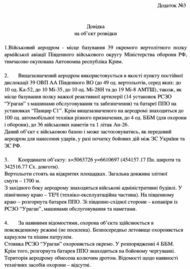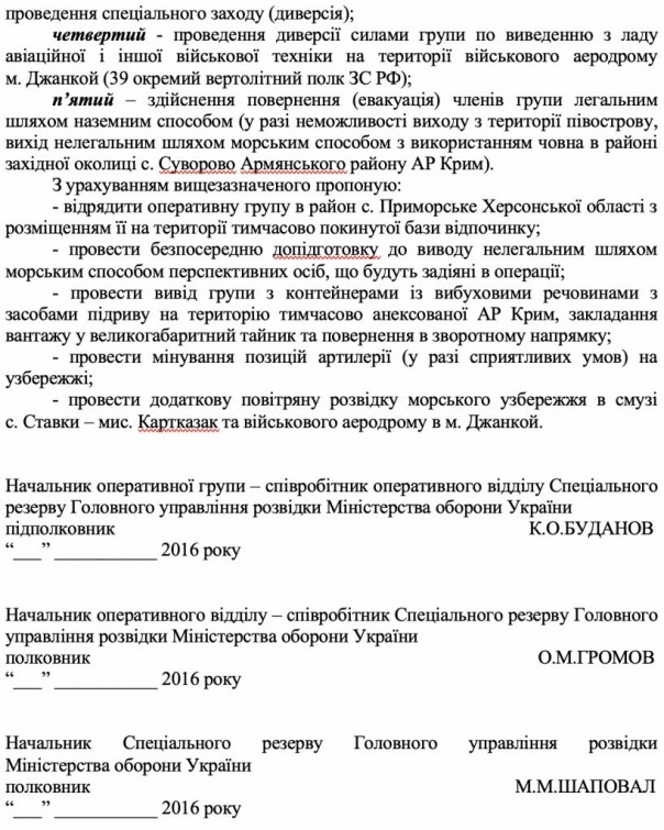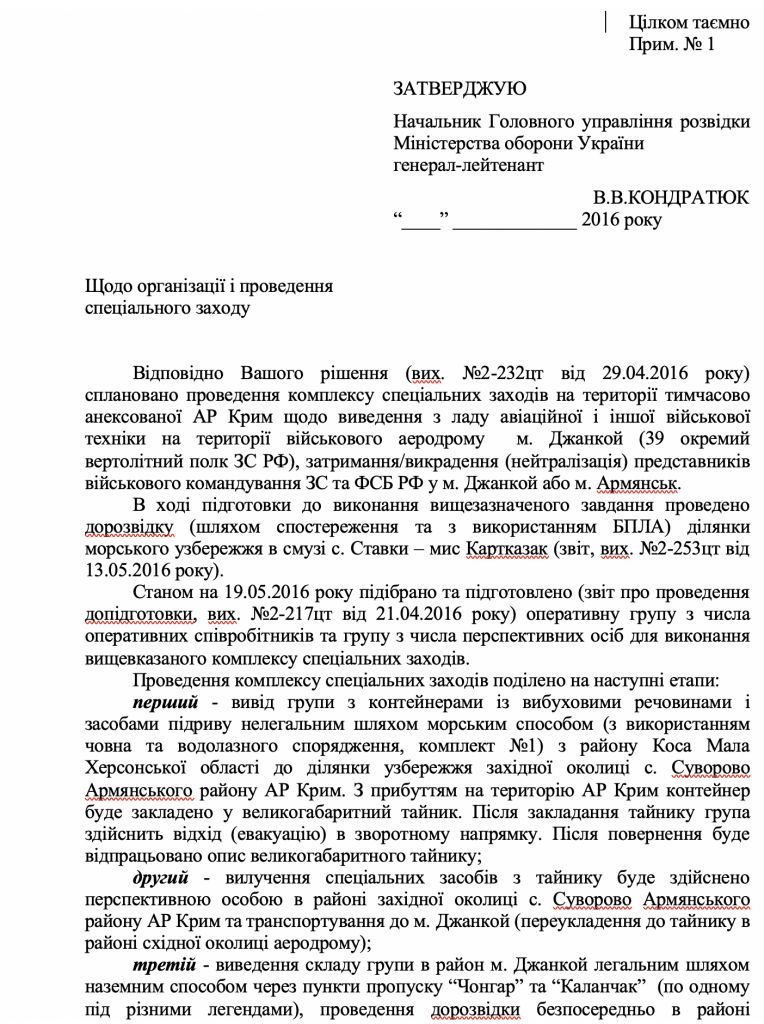 План многоходовой операции взрывать, сжигать и убивать в Крыму долго вызревал в головах сотрудников Специального резерва ГУР Минобороны Украины. Еще 3 февраля 2016 г. начальнику ГУР МОУ генерал-лейтенанту Кондратюку В.В. было доложено, что на территории ранее законсервированного аэродрома в г. Джанкой Республики Крым «командование ВС РФ создало и развернуло 39 отдельный вертолетный полк армейской авиации». На вооружении полка — десятки новейших и модернизированных ударных вертолетов, развернута батарея ПВО «Панцирь С1».