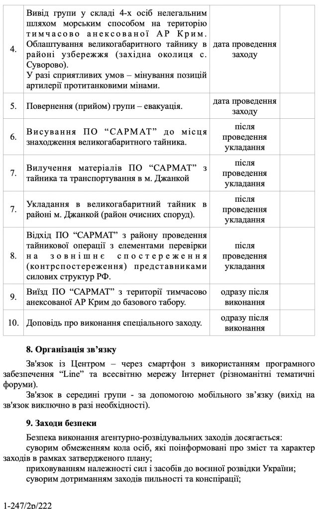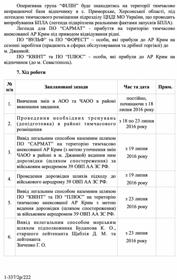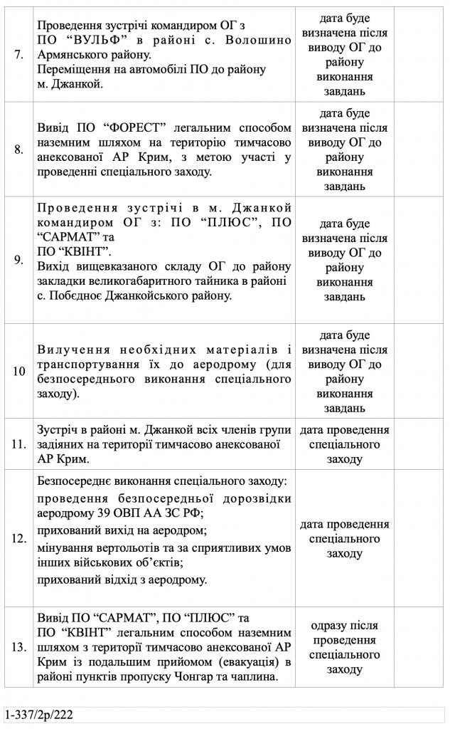 Судя по документам ГУР, «спецмероприятие» должно было состоять из пяти этапов. На первом этапе планировалось доставить контейнеры со взрывчаткой и средствами подрыва на территорию России морским способом с помощью надувных лодок и водолазного снаряжения «из района Коса Малая Херсонской области к участку побережья западной околицы с. Суворово Армянского района АР Крым». Затем — закладка тайника и эвакуация группы на Украину. Второй этап — перезаклада тайника уже другими лицами в районе, непосредственном примыкающем к месту диверсии на восточной окраине аэродрома в Джанкое. На третьем этапе планировалось легальное прибытие диверсантов к Джанкою через пункты пропуска «Чонгар» и «Каланчак». Четвертый и пятый этапы — диверсия и эвакуация исполнителей на Украину. Если подробнее, то в планах высадки подразумевалось ведение боевых действий с российскими силовиками, минирование и подрыв вертолётов, ЗРК «Панцирь» и систем залпового огня в Джанкое.