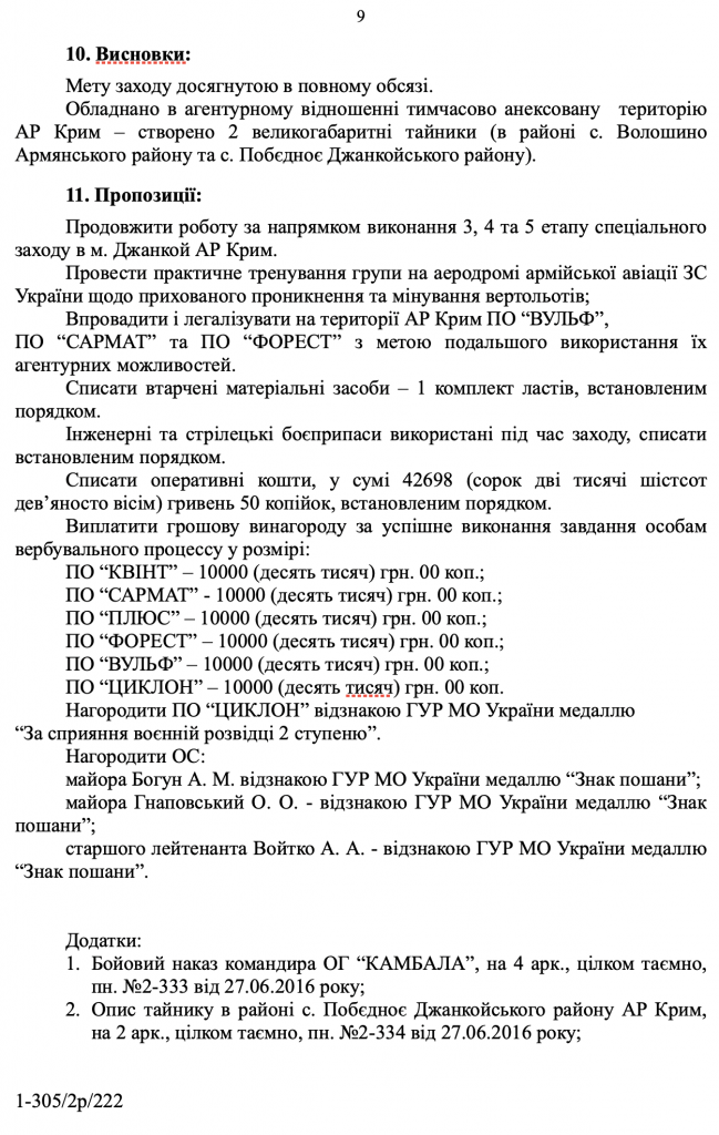 Затем агенты «Сармат», «Форест», «Вульф», «Квинт» и «Плюс» сумели перенести тайник ближе к аэродрому Джанкоя — в село Победное. «Сармат» прибыл в Крым, якобы, на отдых к родне.
