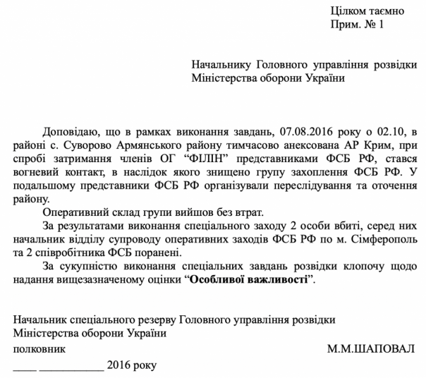 Уже после бегства из Крыма начальник Спецрезерва полковник Шаповал доложил начальнику ГУР МОУ генералу Кондратюку об «уничтожении группы захвата ФСБ РФ» членами ОГ «Филин» 02.10 07.08.2016 в районе с. Суворово. В военной разведке Украины принялись строчить наградные листы за операцию. Правда, спустя месяц стали проводить расследование, почему так и не удалось атаковать аэродром в Джанкое и взорвать вертолеты. По словам подполковника Абдыллаева, крайним за провал акции сделали начальника оперативного отдела СР ГУР МОУ Александра Громова.