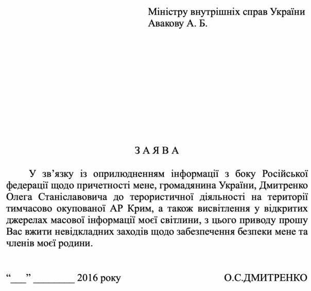 Агент «Плюс», он же Олег Дмитренко, после возвращения из Крыма сильно испугался за свою жизнь и обратился с заявлением к министру внутренних дел Украины Авакову А.Б. С просьбой «принять неотложные меры по обеспечению безопасности меня и членов моей семьи» в связи «с обнародованием информации со стороны Российской Федерации о причастности меня, гражданина Украины, Дмитренко Олега Станиславовича к террористической деятельности».