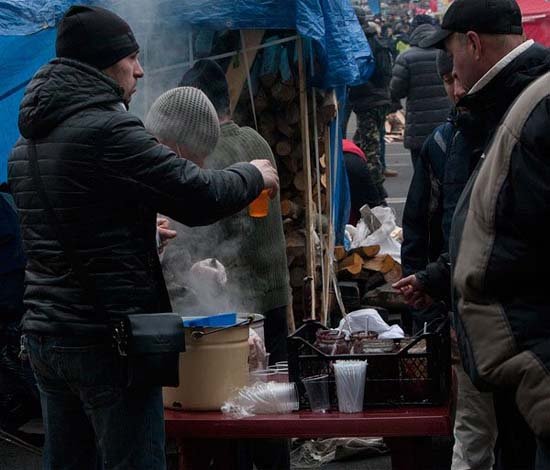 «Оппозиционные штабы обеспечивают кухню базовыми вещами — водой, хлебом, посудой. Продуктовые запасы Евромайдана пополняют неравнодушные украинцы — они и формируют ежедневное меню митингующих», — объсняет Александр marv. В симпатичных девушек-волонтерок поверить можно, в толпы добровольных снабженцев — не получается.