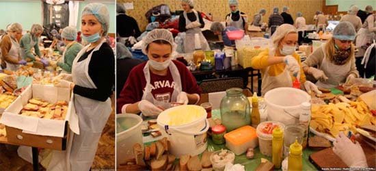 Тем не менее, еды действительно всем хватает. Ее можно увидеть, например, на умилительном фоторепортаже Александра marv о кухне Майдана. Активист запечатлел, как десятки, а то и сотни волонтеров готовят бутерброды.