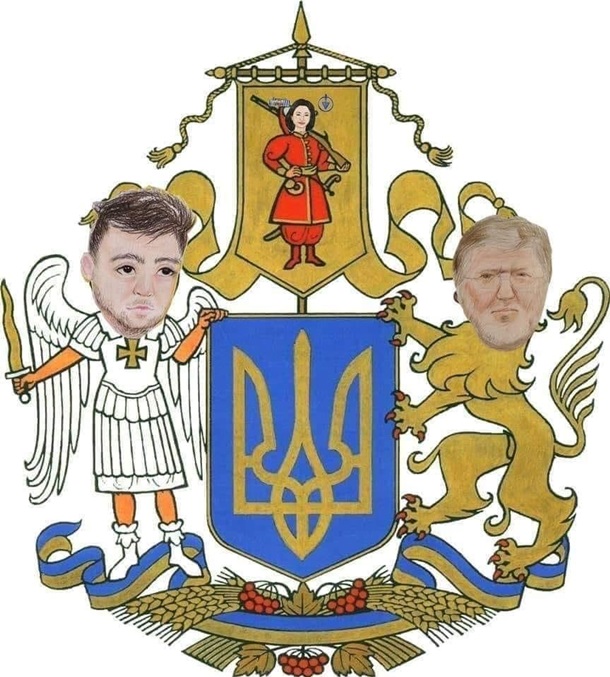 Дальше ещё более странно. Верхняя позиция в геральдике - самая главная. То есть, вон тот "человек с ружьём" без имени и фамилии (хотя у геральдических фигур их и не должно быть) - он верховодит и над небесным архангелом Михаилом и над львом без определённого места жительства. При этом казак - явный висельник, он вздёрнут на рее и в таком вот виде всем рулит. Венчает эту неуклюжую конструкцию наконечник копья. То есть, оружие "понад усе" - выше христианства, людей и животных - именно оно всем управляет на Украине. Ну так читается геральдически, по крайней мере.