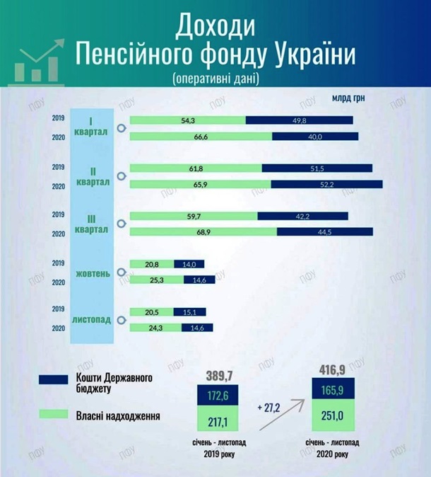 Доходы Пенсионного фонда Украины (ПФУ) за январь-ноябрь 2020 года составили 416,9 млрд гривен, расходы - 435,3 млрд гривен. Таким образом, дефицит средств фонд достиг 18,4 млрд гривен, сообщает пресс-служба ведомства. В общих доходах ПФУ средства государственного бюджета составили 165,9 млрд гривен, говорится в сообщении.