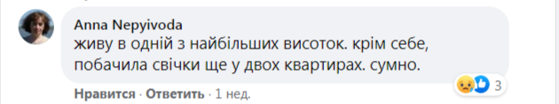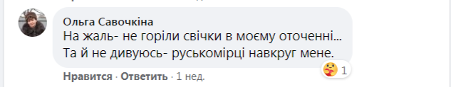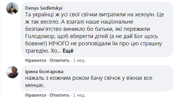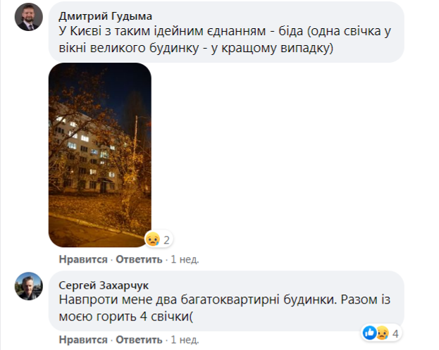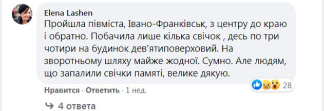 «К сожалению, с каждым годом вижу свечей в окнах всё меньше», «Увы, не горели свечи в моём окружении... Да и не удивляюсь — русскомирцы вокруг меня», «Живу в одной из самых больших высоток. Кроме себя, увидела свечи ещё в двух квартирах. Грустно», «Прошла полгорода, Ивано-Франковск, из центра до конца и обратно. Увидела лишь несколько свечей, где-то по три-четыре на дом девятиэтажный. На обратном пути почти ни одной. Грустно», «В Киеве с таким идейным единением — беда (одна свеча в окне большого дома — в лучшем случае)», «Напротив меня два многоквартирных дома. Вместе с моей горит 4 свечи», «Ковель — просто ужас... Город 60 тысяч, свечек — единицы», — значится в комментариях. Источник