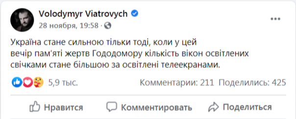 Бывший глава Украинского института национальной памяти, ныне нардеп от партии Петра Порошенко написал 28 ноября в Facebook, что «Украина станет сильной только тогда, когда в этот вечер памяти жертв Голодомора количество окон, освещённых свечами, станет больше, чем освещённых телеэкранами».