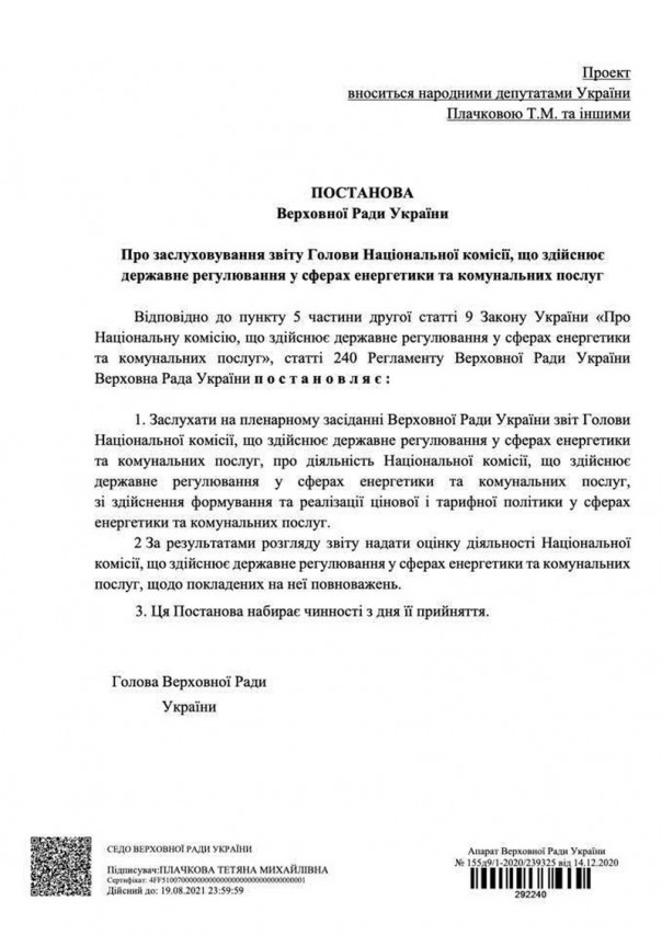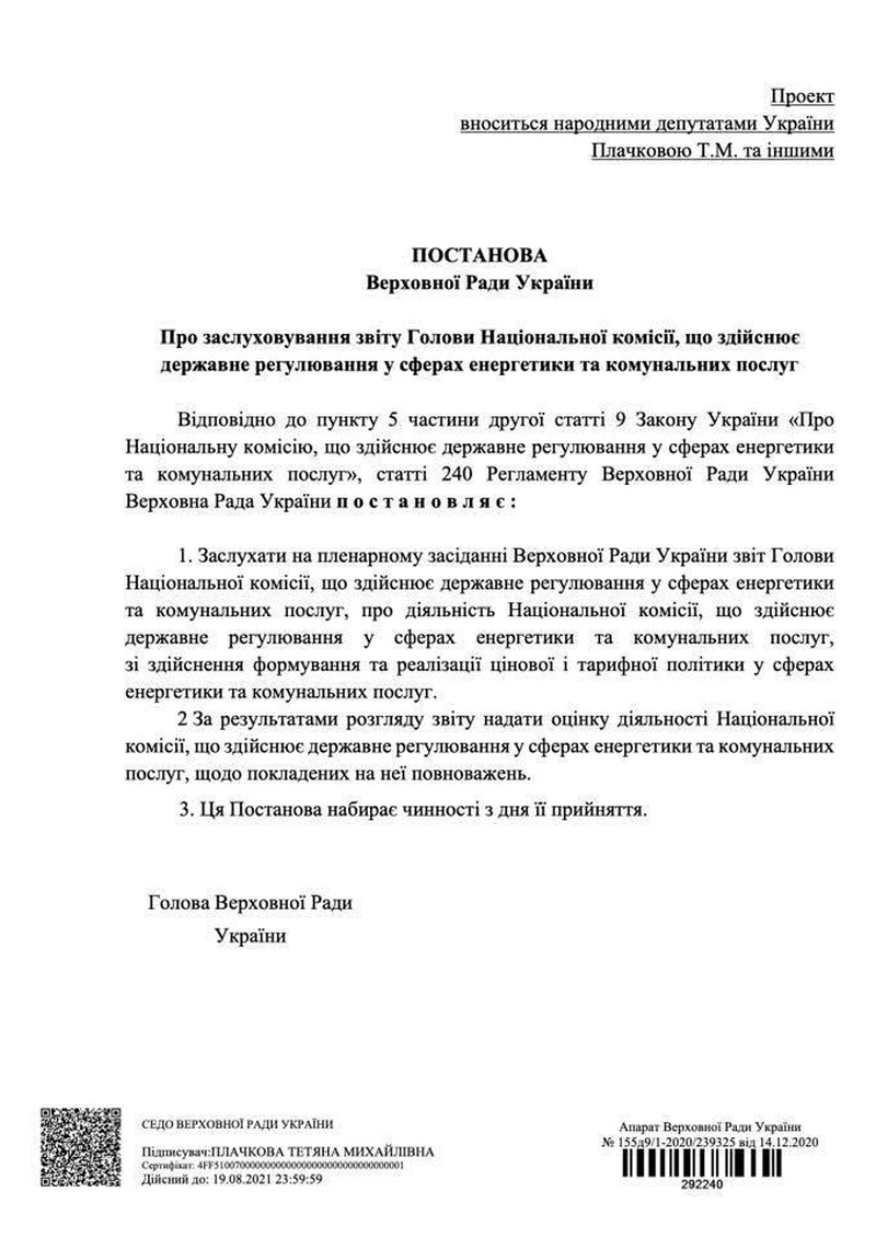 Как подчеркнула нардеп, свою ответственность за чрезмерное и постоянное увеличение тарифной нагрузки на людей представители власти переводят именно на этого регулятора и обосновывают это его юридической независимостью. Однако Нацкомиссия по закону подотчетна Верховной Раде. Поэтому парламент должен дать оценку деятельности регулятора, а общество — получить полную и объективную информацию о его ценовой и тарифной политике.