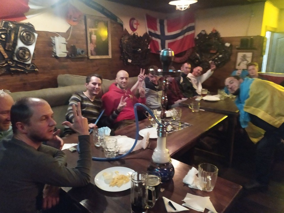 Н. Коханивский – в центре в кожаной куртке, слева от него О. Овчинников, с левого края – Е. Толстая, справа – один из украинских «побратимов» с надписью нацистского подразделения «Nachtigall» на свитшоте