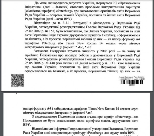 Нардеп заявила, что к ней обратилась общественная организация «Правозащитная инициатива» — «касательно проблемы использования гарнитуры (семейства шрифтов) "Peterburg" при изготовлении оригиналов актов Верховной Рады Украины».
