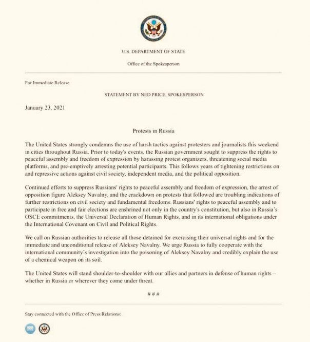 Администрация Байдена выпустила срочное заявление по протестам в России. Требуют безоговорочного освобождения Навального и задержанных, а также сотрудничества с «международным сообществом» в деле о его отравлении и применении химического оружия(!)