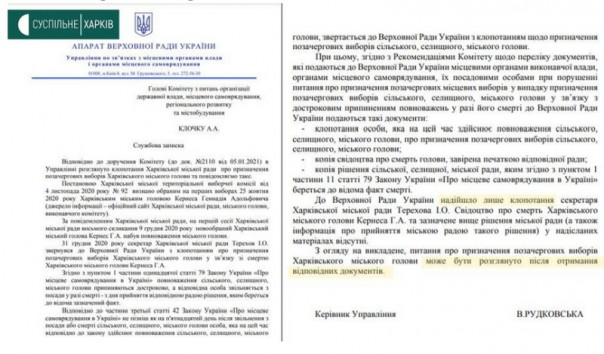 Верховная Рада Украины не может назначить внеочередные выборы мэра Харькова, поскольку городской совет не представил необходимые документы, а именно, копию свидетельства о смерти Геннадия Кернеса, заверенную печатью горсовета, а также решения совета о принятии к сведению факта смерти.