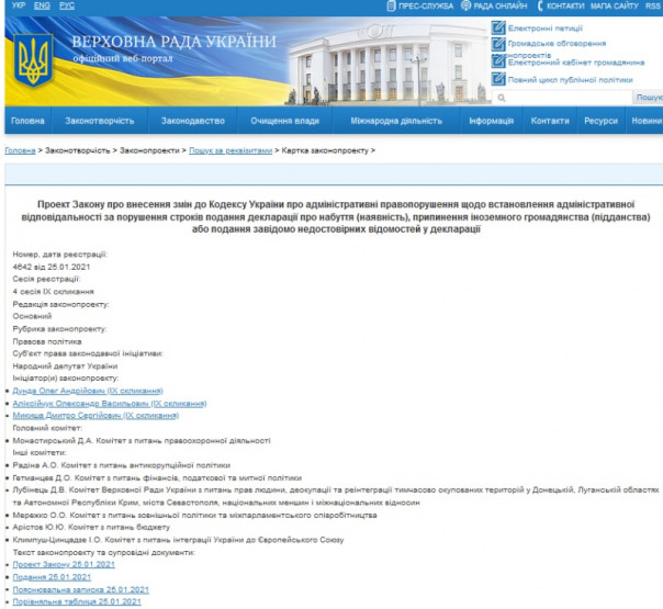 Согласно законопроекте № 4642, «лица, которые получили или вышли из иностранного гражданства обязаны в месячный срок подать декларацию о получении или прекращении иностранного гражданства в центральный орган исполнительной власти, который реализует политику в сфере гражданства». За игнорирования этих требований, несвоевременную или заведомо ложную подачу декларации предлагается штрафовать на сумму от 340 до 510 тыс. гривен или же уголовная ответственность — от 2 до 5 лет лишения свободы.