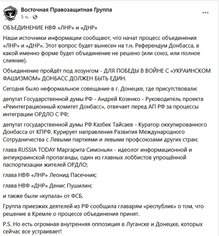 «Наши источники информации сообщают, что начат процесс объединения „ЛНР‟ и „ДНР‟. Этот вопрос будет вынесен на так называемый „референдум Донбасса‟. В какой именно форме будет объединение — не решено (или союз, или полное слияние)», — говорится в сообщении.