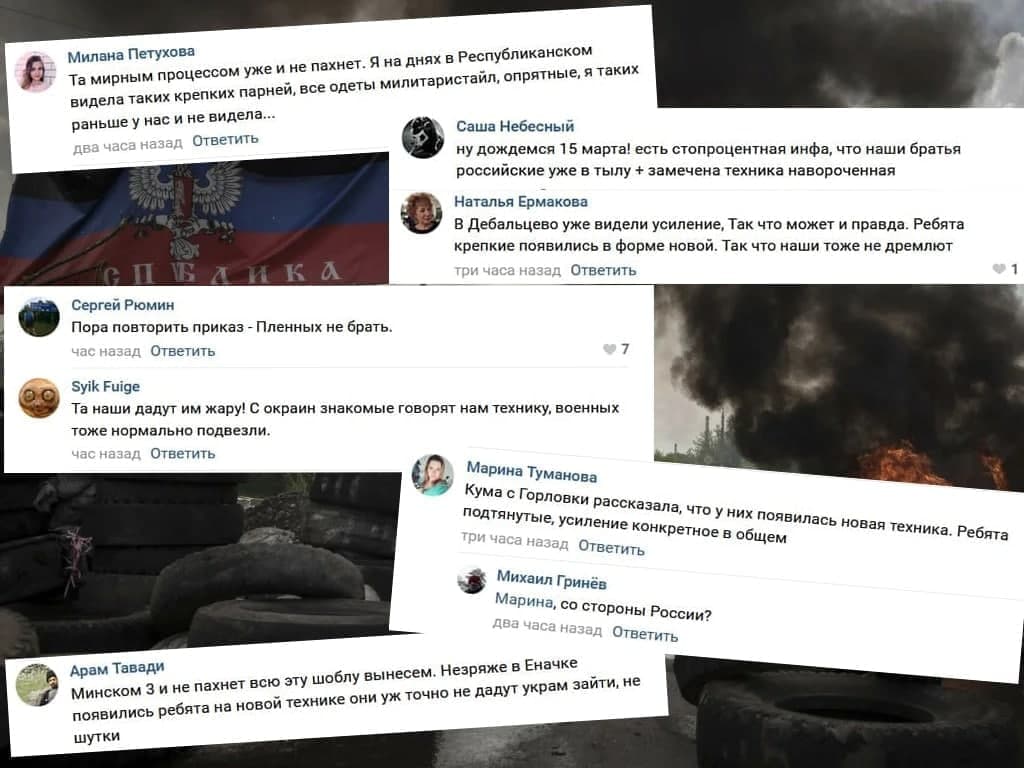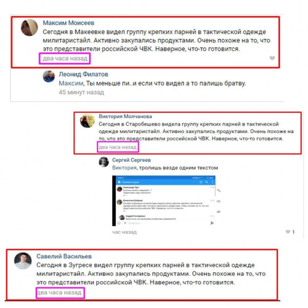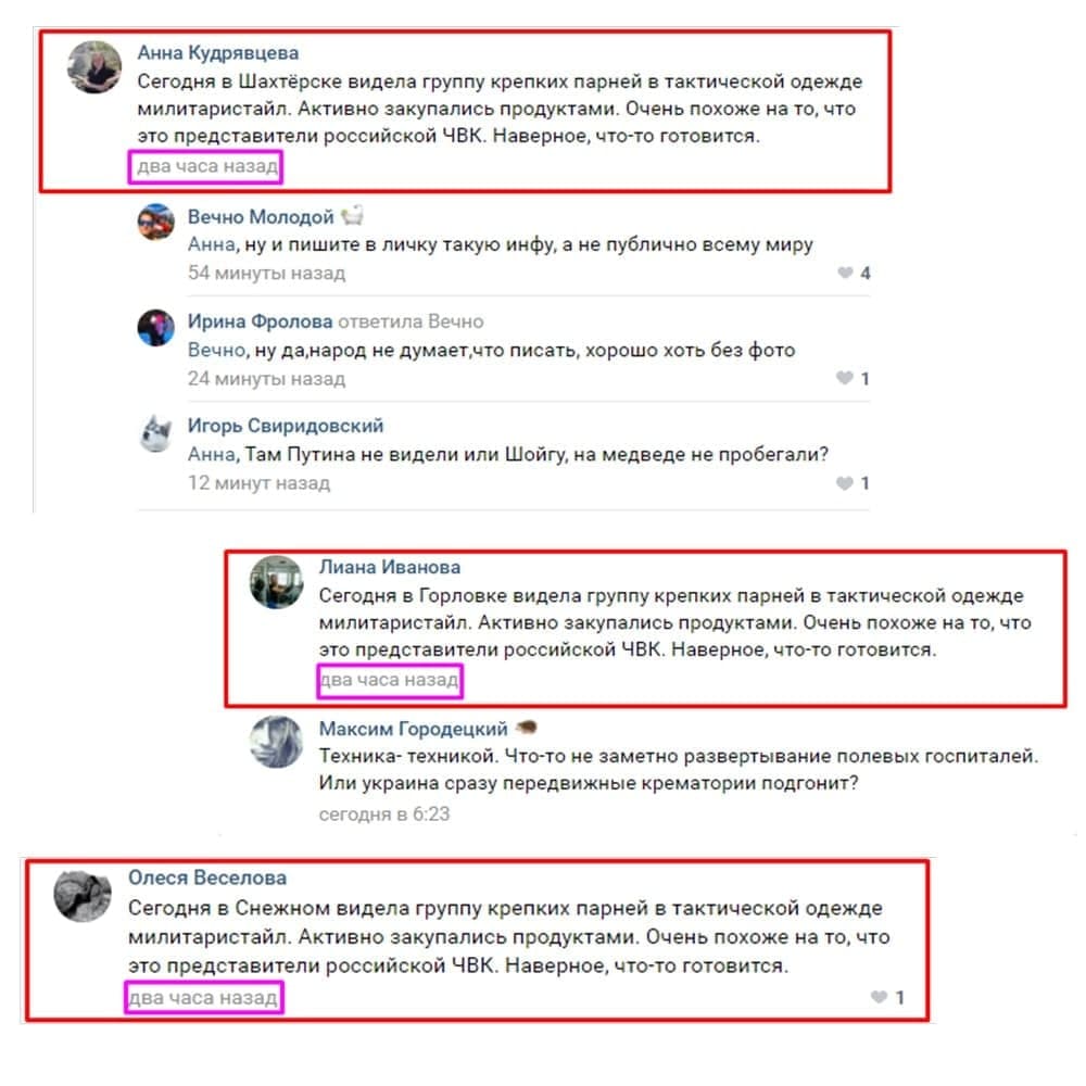 Сегодня, во время мониторинга социальных сетей, сотрудниками Министерства информации ДНР были обнаружены массовые информационные вбросы украинскими подложными аккаунтами (ботами), которые ведутся якобы от лица местных жителей ДНР. В одно время, десятки украинских ботов вбрасывали информацию о том, что в ДНР зашли российские ЧВК. Многие боты использовали один и тот же текст, меняя только населённые пункты: