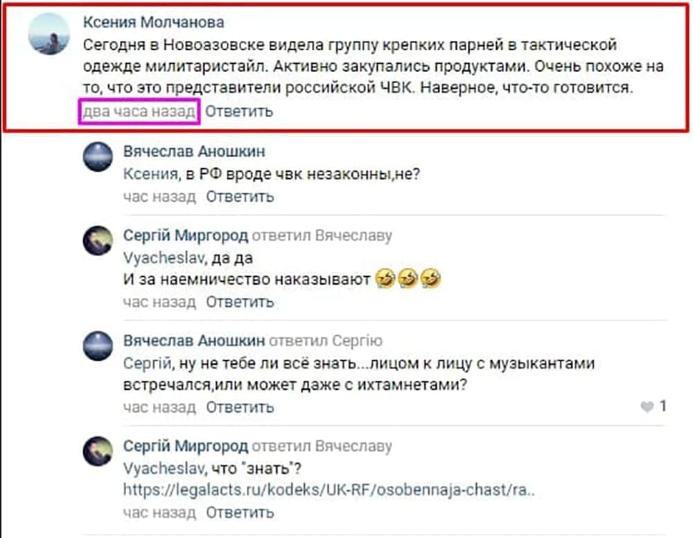 «Сегодня в Шахтёрске видел группу крепких парней в тактической одежде милитаристайл. Активно закупались продуктами. Очень похоже на то, что это представители российской ЧВК. Наверное, что-то готовится».
