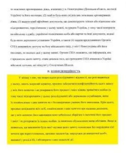 При этом стоит обратить внимание, что американская сторона требует от украинцев не разглашать материалы расследования, а также собрать со всех участников расписки о неразглашении информации. Кроме того, все участники должны информировать юридического атташе ФБР Лору Кригбаум или прокурора Дебора Гейнусао обо всех своих шагах.