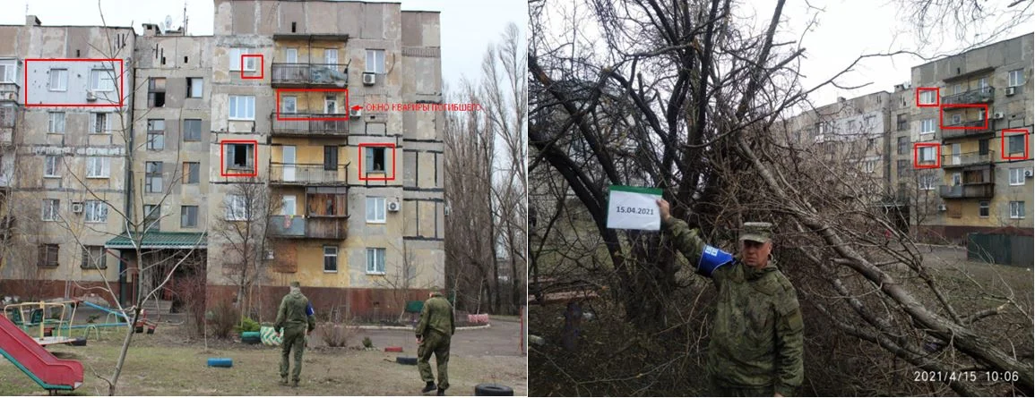 Дальше редакция издания удивляется отсутствию следов разрыва боеприпасов на самом доме где жил убитый, выдвигая версию о мистическом снайпере. Если открыть фотоотчет сделанный СЦКК ДНР – версия снайпера рассыпается моментально, однако украинская сторона решает проигнорировать разбитые окна, скошенные деревья вокруг дома, что в целом и не удивительно. Считаем необходимым самим переспросить: какой снайпер?