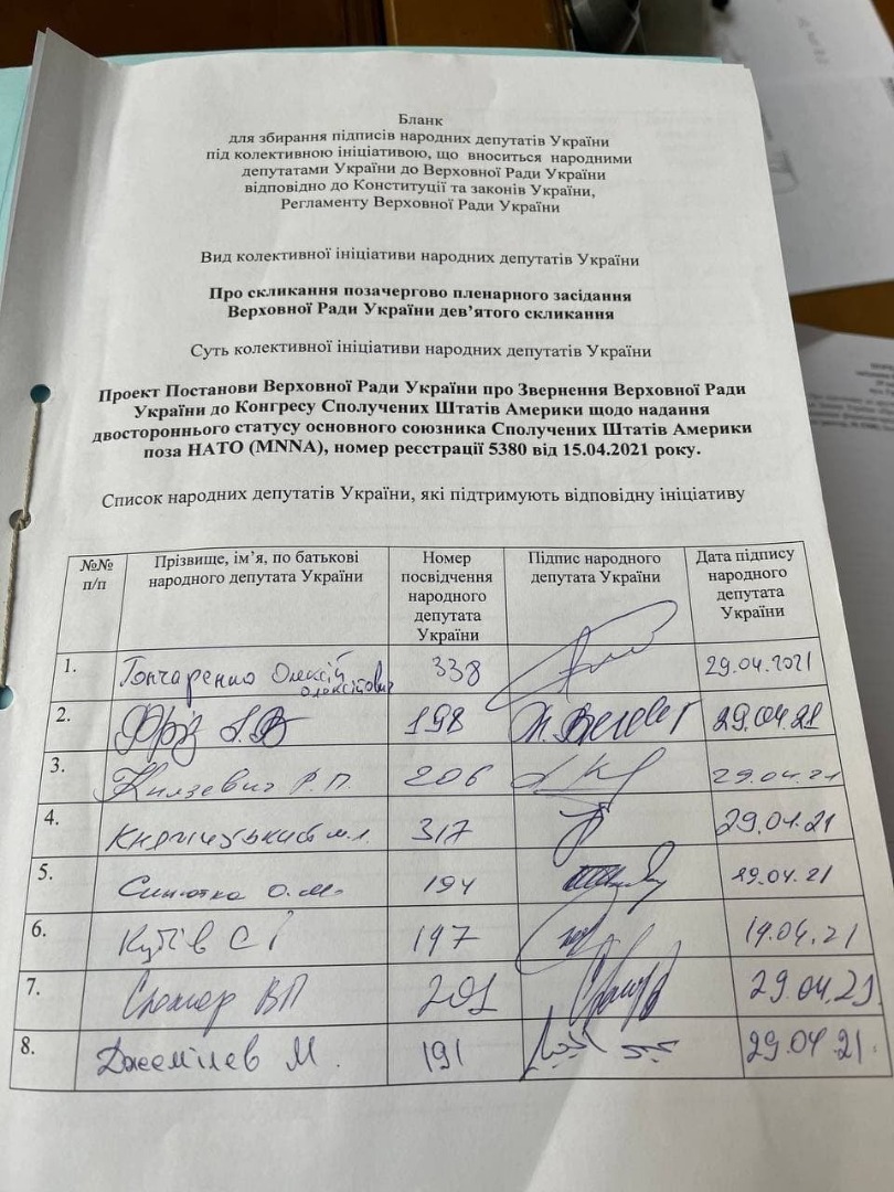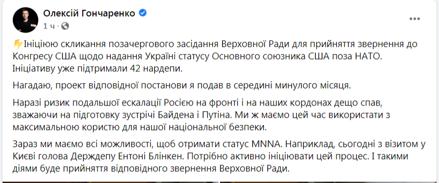 Народный депутат из фракции Петра Порошенко «Европейская солидарность» Алексей Гончаренко созывает парламент на внеочередное заседание для принятия обращения к Конгрессу США о предоставлении Украине статуса Основного союзника США вне НАТО (MNNA).