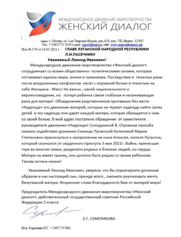 Узнав о проблеме, помочь Марии Антиповой пытаются общественники из России. Руководитель международного движения миротворчества «Женский диалог» обратилась к главе ЛНР Леониду Пасечнику с просьбой позволить женщине приехать на могилу сына.