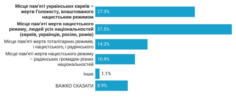 37,5% респондентов ответили, что для них Бабий Яр — это место памяти жертв нацистского режима, людей всех национальностей (евреев, украинский, русских, цыган). 27,3% — место памяти украинских евреев — жертв Холокоста, устроенного нацистским режимом. 14,3% опрошенных ответили, что место памяти жертв тоталитарных режимов: и нацистского, и советского. 10,9% — место памяти жертв нацистского режима — советских граждан разных национальностей. 8,9% затруднились ответить.