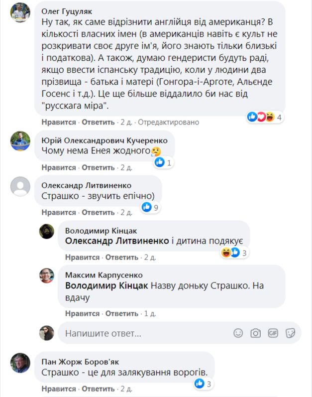 «Ну так, как отличить англичанина от американца? По количеству собственных имен (у американцев даже есть культ не раскрывать свое второе имя, его знают только близкие и налоговая). А также, думаю, гендеристы будут рады, если ввести испанскую традицию, когда у человека две фамилии - отца и матери (Гонгора-и-Арготе, Альенде Госенс и т.д.). Это еще больше отдалило бы нас от "русскаго мира"», - написал, в частности, Олег Гуцуляк.