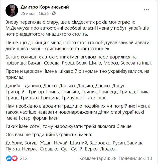 Вот вам еще традиционные украинские имена: Добрик, Богуш, Ждан, Нечай, Щасний, Здоровко, Русан, Завиша, Путята, Некрас, Страшко, Сул, Сулій, Берко, Людко...», - написал Корчинский.