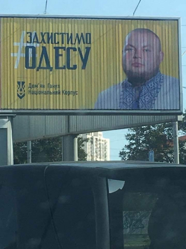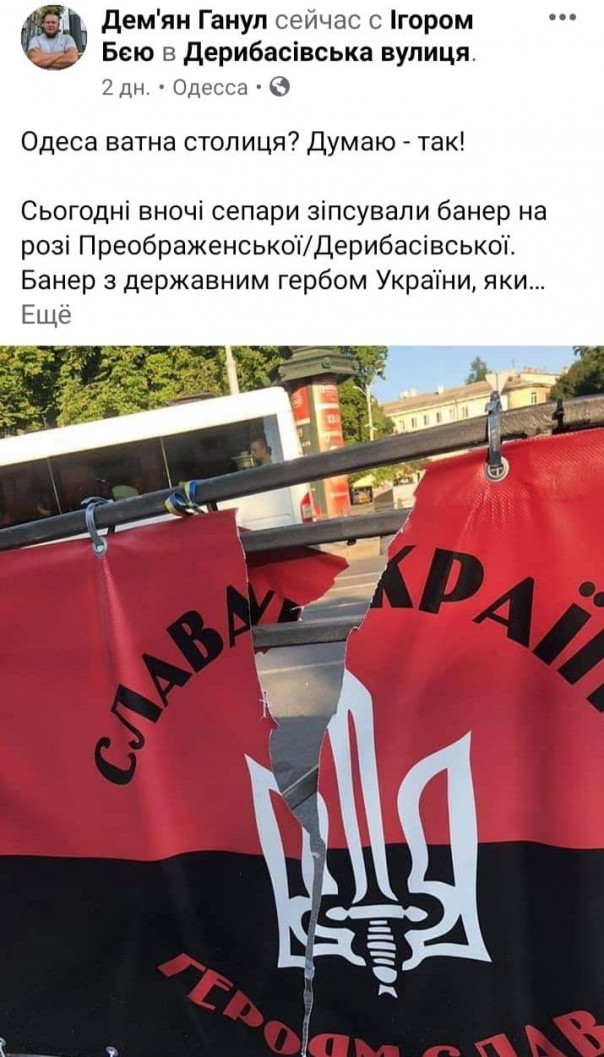 И вот теперь Ганул возмущается: «Сепары испортили баннер на углу Преображенской и Дерибасовской. Баннер с государственным гербом Украины, который мы недавно возобновили. Это прямое надругательство над государственными символами…Также отмечу, что лозунг «Слава Украине — Героям Слава» официально является поздравлением. Полиция Одесской области, чем вы занимаетесь? Также в этом виноват ватный мэр Геннадий Труханов, который упорно игнорирует создание поста муниципальной стражи в этом месте. За любую достоверную информацию о лицах, которые повредили баннер с изображением государственных символов, гарантирована награда — 10 000 грн.!».