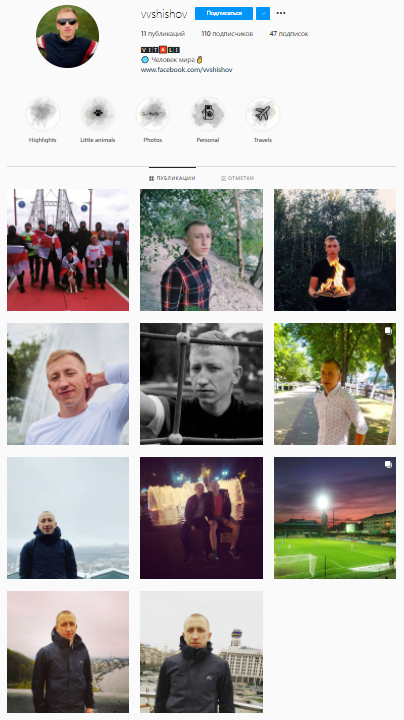 В своих соцсетях он выложил за несколько лет лишь несколько фотографий. В Инстаграме у него встречаются фото в основном из Гомеля (Беларусь), а также Киева и Львова.