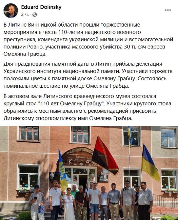 В посёлке Литин Винницкой области состоялись торжественные памятные мероприятия в честь 110-летия со дня рождения нацистского военного преступника, причастного к убийству 30 тысяч евреев, Омеляна Грабца.