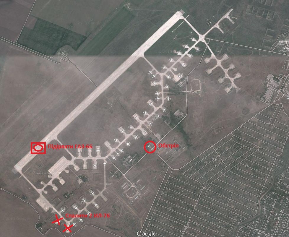 Только действуйте внимательно и осторожно. 25 бригада сейчас на боевых заданиях, так что не поступаете самолетам большой вред. Там есть уже поврежденные самолеты, вот с ним можно делать все. Їхни бортовые номера вам дадут. Помни, надо, чтобы все было как настоящая атака российского спецназа.