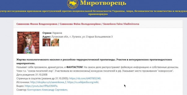 "Миротворец" разместил в своей базе личные данные, фотографии Савенковой и скриншоты ее публикаций. Девочку обвиняют в том, что она "участвует в антиукраинских пропагандистских мероприятиях", а также "называет себя прозаиком, драматургом и ФАНТАСТОМ!" "Миротворец" просит правоохранительные органы Украины "рассматривать данную публикацию на сайте как заявление о совершении этим гражданином осознанных деяний против национальной безопасности Украины, мира, безопасности человечества и международного правопорядка, а также иных правонарушений".