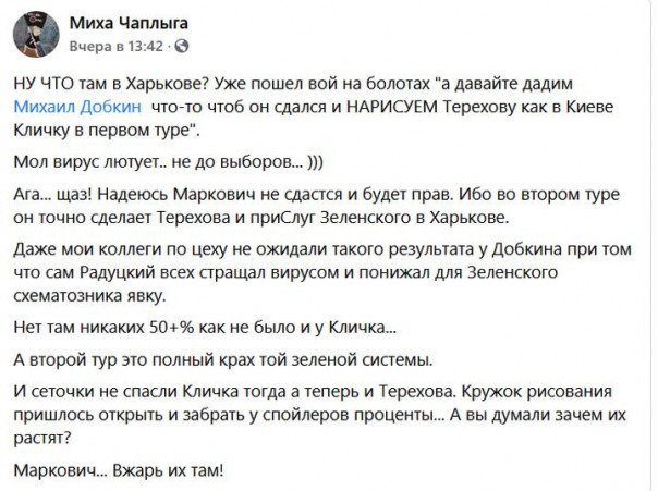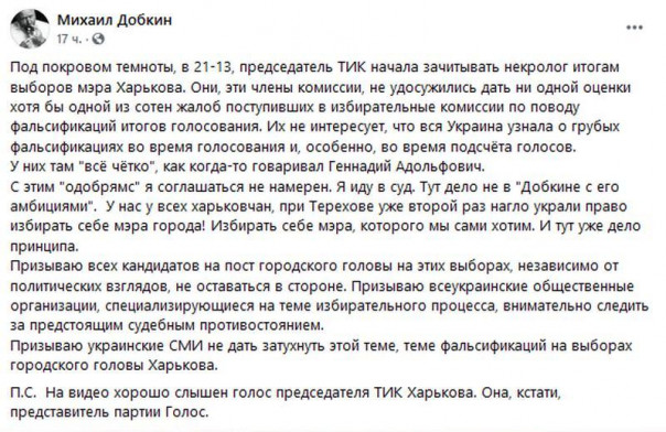 «Результаты выборов останутся неизменными. Терехов стал мэром Харькова», — резюмировал он.