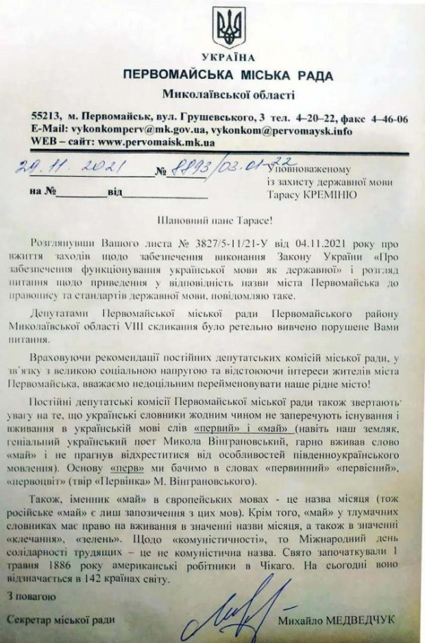 Рассмотрев Ваше письмо №3827/5-11/21-У от 04.11.2021 года о принятии мер об обеспечении исполнения закона Украины «Об обеспечении функционирования украинского языка как государственного» и рассмотрении вопроса о приведении в соответствие названия города Первомайск с правописанием и стандартами государственного языка, сообщаю следующее.