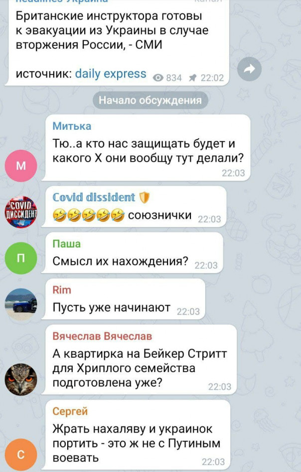 - в случае нашей военной операции воевать Запад не будет, а будет искать варианты санкций. Слово "эвакуация" довольно беззубое, и вполне ясно обозначающее роль Британии в этой ситуации