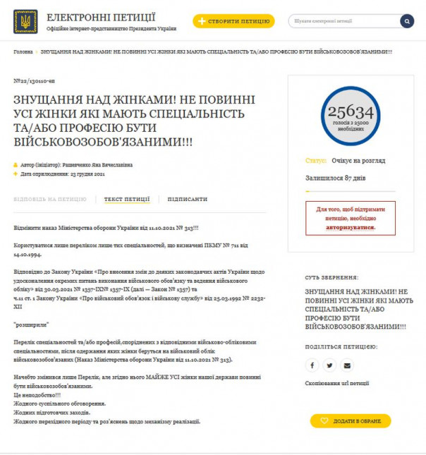 За 4 дня электронная петиция об отмене нового порядка обязательного воинского учета для женщин на Украине, в том числе беременных и имеющих несовершеннолетних детей, набрала более 25 000 голосов. Этого достаточно, чтобы ее рассмотрел президент страны.