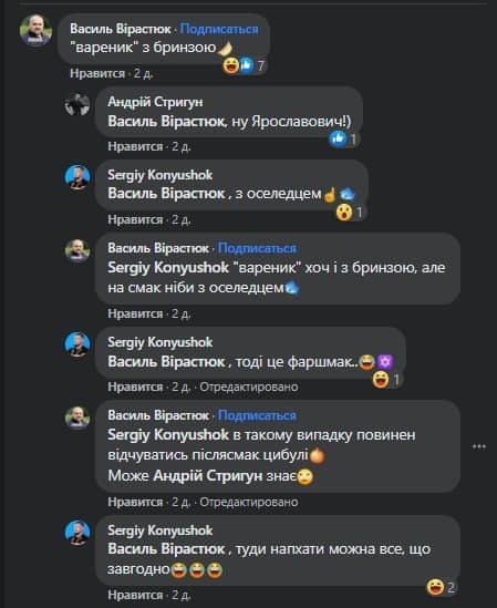 "Вареник" с брынзой, - прокомментировал Вирастюк. Ниже он уточнил, что хотя "вареник" с брынзой, но на вкус будто с селедкой.