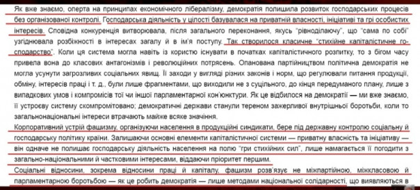 Николай Сциборский, в частности, утверждает, что социальные отношения, в том числе, отношения труда и капитала, фашизм развязывает не межпартийной, межклассовой и парламентской борьбой – как это делает демократия – а лишь методами национальной солидарности. При этом фашизм наилучшим образом обеспечивает национальное развитие, так как хочет видеть державу и нацию могучими и великими, и для этого он объединяет вокруг общего национального идеала все социальные группы, определяя лозунг «Нация и держава» выше классов и партий. Всё это исключает режим политической демократии. Идеализм и волюнтаризм для Сциборского – очень позитивные вещи, а вот реальные интересы – ругательство. Он неустанно ругает демократию, а парламентаризм, с его точки зрения, это вообще падение на дно. Мол, идейная и духовная философия фашизма – это вам не демократия, являющаяся интернациональной утопией.