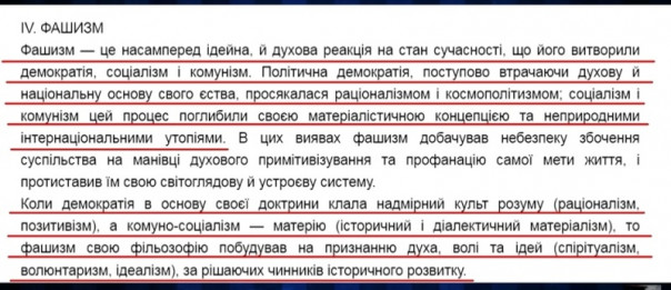 «Лозунги о мире, справедливости, братстве, равенстве и интернационализме демократы своей практической деятельностью превратили в спекулятивную ложь, в издевательство над человеком. Фашизм же проявил честность перед собой, когда вместо лицемерных лживых фраз поставил на повестку дня нашей эпохи неприкрытую правду жизненной концепции, что извечно опирается на действенную мораль, на законы противоборства и на право силы… Те народы, которые испуганно отворачиваются от императивных заповедей фашизма в силу своей слепой некритичной привязанности к наркозу демо-социаолистической лжи про мир, согласие, благоденствие и какие-то интернационалы – те народы никогда не смогут достичь мира и свободы. Назначение таких народов – быть перегноем для других!», – цитата Николая Сциборского.
