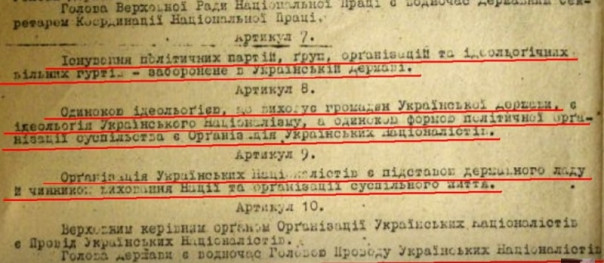 Проще говоря, ОУНовцам не удалось построить свою Украину, а она, судя по архивным документам, должна была быть, мягко говоря, вовсе не такой, как сейчас. Так, согласно артикулам проекта Конституции авторства Николая Сциборского, Украина по ОУНовски – это авторитарная и тоталитарная держава. Глава этой Украинской державы является вождем нации и правит ею пожизненно. При этом никаких выборов, голосований и прочего плебисцита: согласно этой Конституции, главу державы выбирает «Великий сбор нации», который он сам же накануне и собирает. Главой державы может стать каждый, но только при одном условии: для этого необходимо быть ОУНовцем. А ОУН, в свою очередь, является единственной разрешенной в стране организацией: другие политические партии, группы, идеологические кружки и прочее категорически запрещены. Единственной идеологией, в которой воспитываются граждане Украинской державы, соответственно, может быть только идеология украинского национализма. При этом единственной политической формой общества, повторимся, является ОУН. А вождь нации, в свою очередь, имеет право единолично объявить войну любому государству.