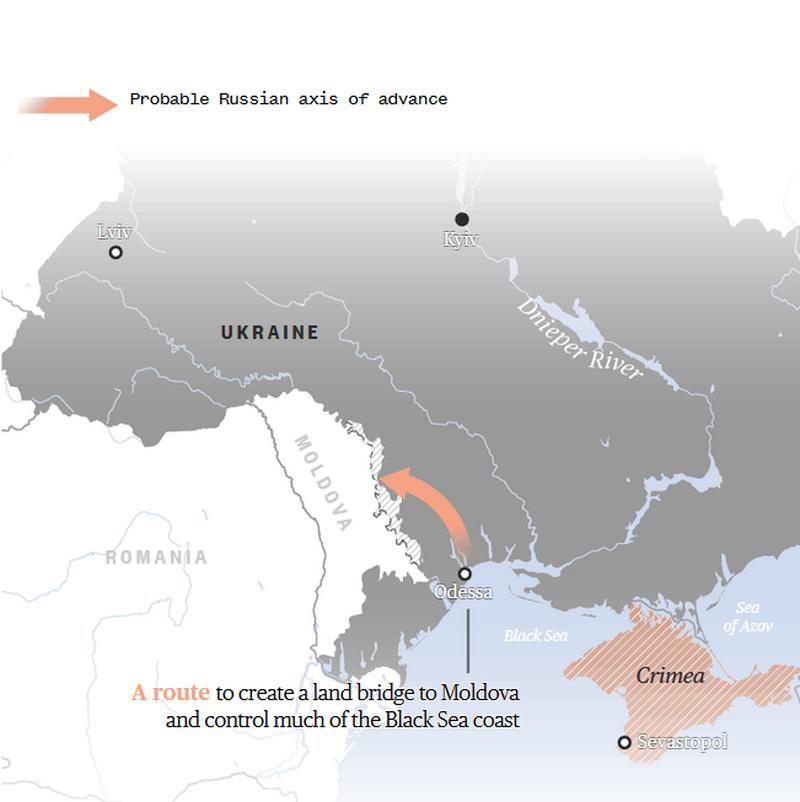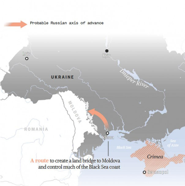 Кроме того, предполагается «высадка десанта для захвата побережья Черного моря, а также переброска авиации и сухопутных подразделений из Одессы в Молдову для создания сухопутного коридора вдоль Черного моря».