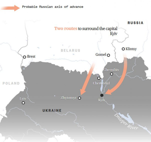 «Ещё более агрессивный вариант предусматривает два дополнительных маршрута атаки с севера для окружения Киева. Он включает использование артиллерийского огня, средств радиоэлектронной борьбы и возможное продвижение наземных войск на юг из Беларуси к Житомиру и на восток к Киеву. Согласно оценкам, при хорошем состоянии дорог в этом районе российские танки и военная техника могут оказаться на подступах к Киеву за два дня», — прогнозируют американские разведчики.
