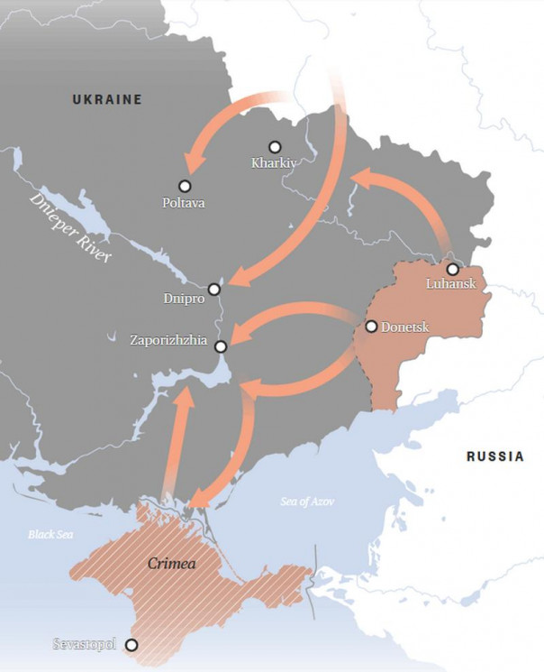 «Согласно одному из подходов, российские военные захватят большую часть украинской территории к востоку от Днепра, где находится около 50% в украинских вооруженных сил, в том числе наиболее боеспособные подразделения. Российские танки и механизированные части пересекут границу Украины и двинутся к Полтаве и Харькову, окружая города по мере продвижения к реке. Сухопутные войска будут наступать по трем направлениям с Донбасса, продвигаясь на юг к Крыму и захватывая побережье вдоль Азовского моря. Российские военные вертолеты будут одновременно поддерживать воздушную атаку из Крыма, говорится в сообщении», — описали «сценарий нападении» в разведке США.