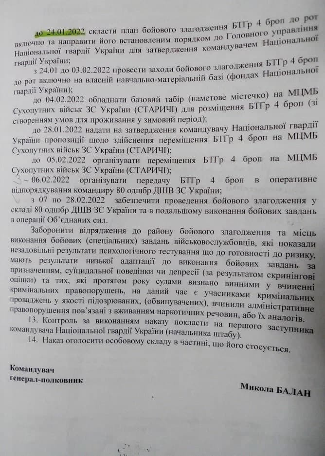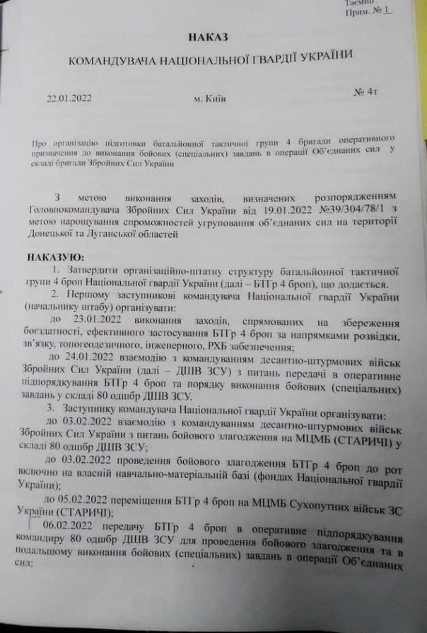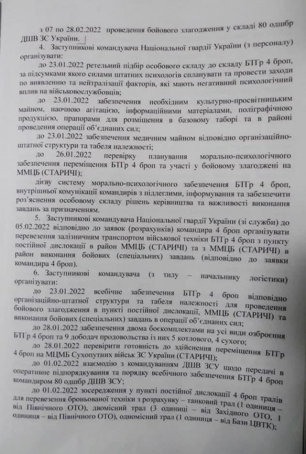 В соответствии с приказом, заместителю командующего нацгвардии была поставлена задача с 7-го по 28-е февраля 2022 организовать боевое слаживание батальонно-тактической группы нацгвардии в составе 80-й отдельной десантно-штурмовой бригады вооруженных сил Украины.