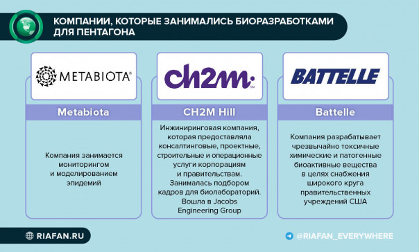 Есть американские лаборатории и в Казахстане, аккурат под боком у России и Китая. Всего их шесть, и на их содержание Пентагон тратит 400 миллионов долларов. Некоторые их них работают при государственных учреждениях. К слову, указанная CH2M Hill также там засветилась. Лаборатории охраняли американские наемники, а о существовании подобных центров стало известно после недавних событий в Казахстане.